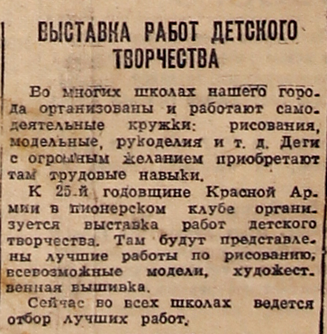 К 25-й годовщине Красной Армии в пионерском клубе организуется выставка работ детского творчества. Там будут представлены лучшие работы по рисованию, всевозможные модели, художественная вышивка.