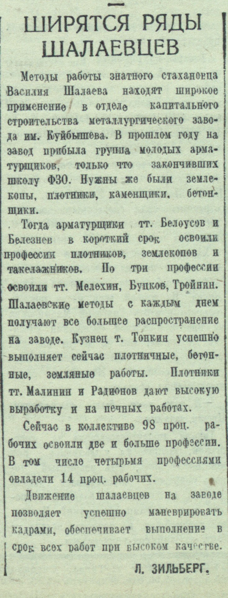 Тогда арматурщики тт. Белоусов и Белезнев в короткий срок освоили профессии плотников, землекопов и такелажников. По три профессии освоили тт. Мелехин, Буцков, Тройнин. Шалаевские методы с каждым днем получают все большее распространение на заводе. Кузнец т. Тонкин успешно выполняет сейчас плотничные, бетонные, земляные работы. Плотники тт. Малинин и Радионов дают высокую выработку и на печных работах.