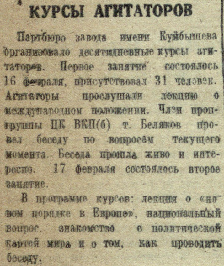 Партбюро завода имени Куйбышева организовало десятидневные курсы aгитаторов. Первое занятие состоялось 16 февраля, присутствовал 31 человек. Агитаторы прослушали лекцию о международном положении. Член пропгруппы ЦК ВКП(б) т. Беляков провел беседу по вопросам текущего момента. Беседа прошла живо и интересно. 17 февраля состоялось второе занятие.