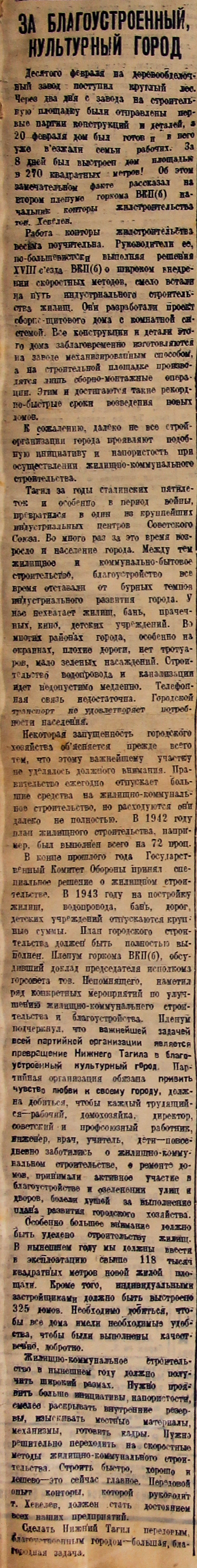 В конце прошлого года Государственный Комитет Обороны принял специальное решение о жилищном строительстве. В 1943 году на постройку жилищ, водопровода, бань, дорог, детских учреждений отпускаются крупные суммы. План городского строительства должен быть полностью выполнен. Пленум горкома ВКП(б), обсудивший доклад председателя исполкома горсовета тов. Непомнящего, наметил ряд конкретных мероприятий по улучшении жилищно-коммунального строительства и благоустройства. Пленум подчеркнул, что важнейшей задачей всей партийной организации является превращение Нижнего Тагила в благоустроенный культурный город. Партийная организация обязана привить чувство любви к своему городу, должна добиться, чтобы каждый трудящийся – рабочий, домохозяйка, директор, советский и профсоюзный работник, инженер, врач, учитель, дети – повседневно заботились о жилищно-коммунальном строительстве, о ремонте домов, принимали активное участие в благоустройстве и озеленении улиц и дворов, болели душой за выполнение плана развития городского хозяйства.