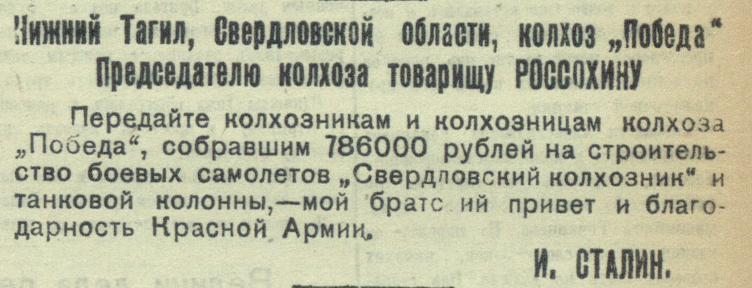 Передайте колхозникам и колхозницам колхоза «Победа», собравшим 786000 рублей на строительство боевых самолетов «Свердловский колхозник» и танковой колонны, – мой братский привет и благодарность Красной Армии.