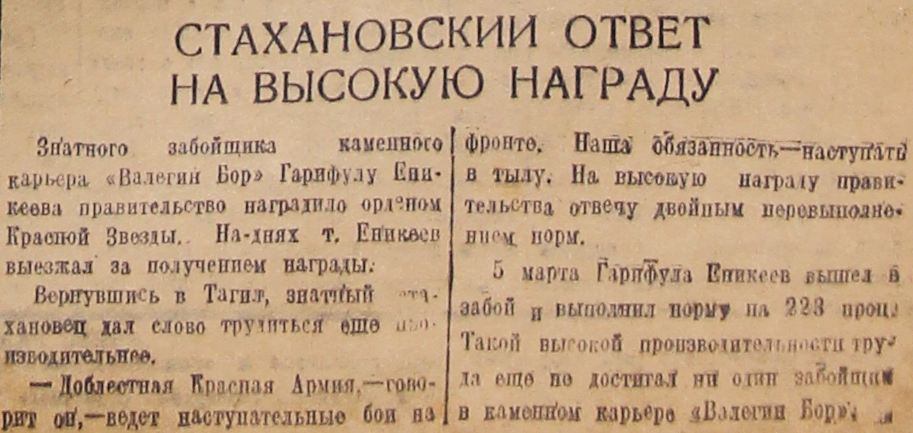 Знатного забойщика каменного карьера, «Валегин Бор» Гарифулу Еникеева правительство наградило орденом Красной Звезды. На-днях т. Еникеев выезжал за получением награды.