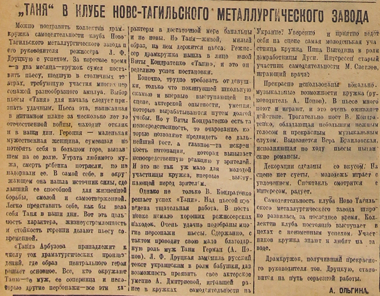 Можно поздравить коллектив драм-кружка самодеятельности клуба Ново-Тагильского металлургического завода и его руководителя режиссера Л.Ф. Друцкую с успехом. За короткое время – в два месяца – кружок сумел поставить пьесу, шедшую в столичных театрах, требующую участия многих персонажей разнообразного амплуа. Выбор пьесы «Таня» для начала следует признать удачным. Пьеса эта, написанная в интимном плане за несколько лет до отечественной войны, находит отклик в наши дни. Героиня – маленькая мужественная женщина, сумевшая не потерять себя в большом горе, выпавшем на ее долю. Утрата любимого мужа, смерть ребенка потрясли, но не надорвали ее. В самой себе, в окружающем она нашла источник силы, сделавший ее способной для жизненной борьбы, смелой и самоотверженной. Легко представить себе, как бы вела себя Таня в наши дни. Вот эта цельность характера, жизнеустремленность и стойкость героини делают пьесу современной.