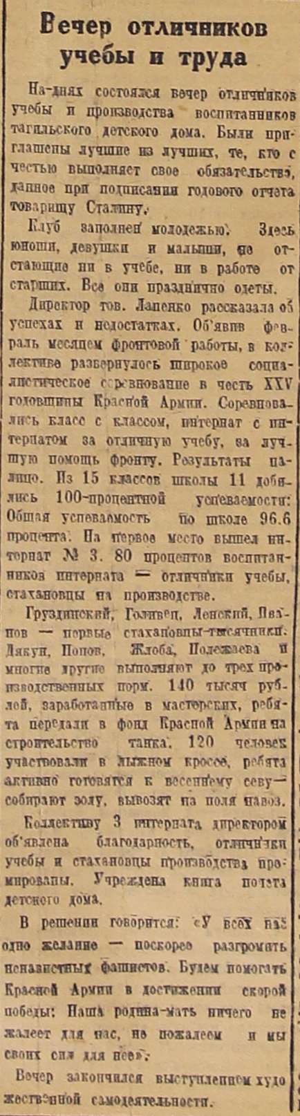 На днях состоялся вечер отличников учебы и производства воспитанников тагильского детского дома. Были приглашены лучшие из лучших, те, кто с честью выполняет свое обязательство, данное при подписании годового отчета товарищу Сталину.