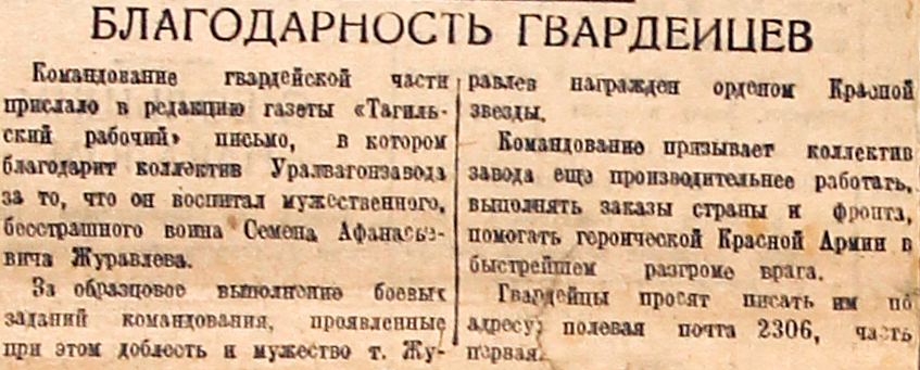Командование гвардейской части прислало в редакцию газеты «Тагильский рабочий» письмо, в котором благодарит коллектив Уралвагонзавода за то, что он воспитал мужественного, бесстрашного воина Семена Афанасьевича Журавлева.