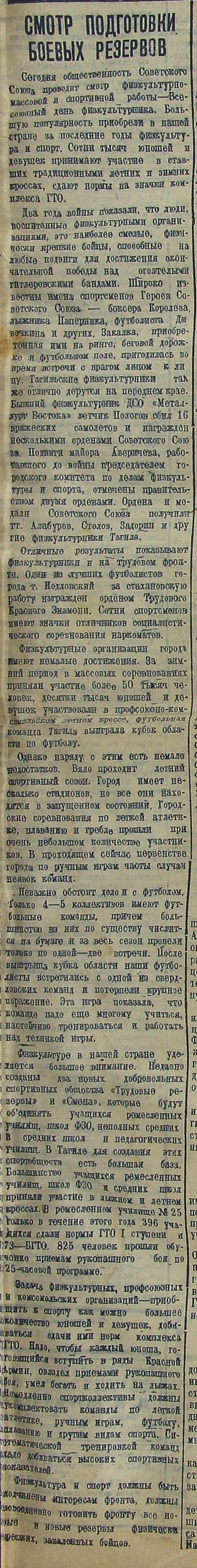 Два года войны показали, что люди, воспитанные физкультурными организациями, это наиболее смелые, физически крепкие бойцы, способные на любые подвиги для достижения окончательной победы над оголтелыми гитлеровскими бандами. Широко известны имена спортсменов Героев Советского Союза – боксера Королева, лыжника Паперника, футболиста Дивочкина и других. Закалка, приобретенная ими на ринге, беговой дорожке и футбольном поле, пригодилась во время встречи с врагом лицом к лицу. Тагильские физкультурники так же отлично дерутся на переднем крае. Бывший физкультурник ДСО «Металлург Востока» летчик Пологов сбил 16 вражеских самолетов и награжден несколькими орденами Советского Союза. Подвиги майора Аверичева, работавшего до войны председателем городского комитета по делам физкультуры и спорта, отмечены правительством двумя орденами. Ордена и медали Советского Союза получили тт. Алабуров, Столов, Задорин и другие физкультурники Тагила.
