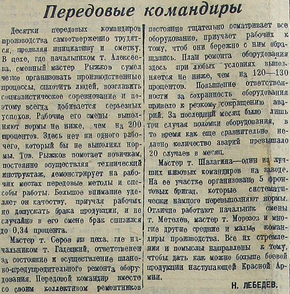 Мастер т. Шалагина - один из лучших низовых командиров на заводе. На ее участке организовано 5 фронтовых бригад, которые систематически намного перевыполняют нормы. Отлично работают начальник смены т. Метелев, мастер т. Морозов и многие другие средние и малые командиры производства. Все их стремления и помыслы направлены к тому, чтобы дать как можно больше боевой продукции наступающей Красной Армии.