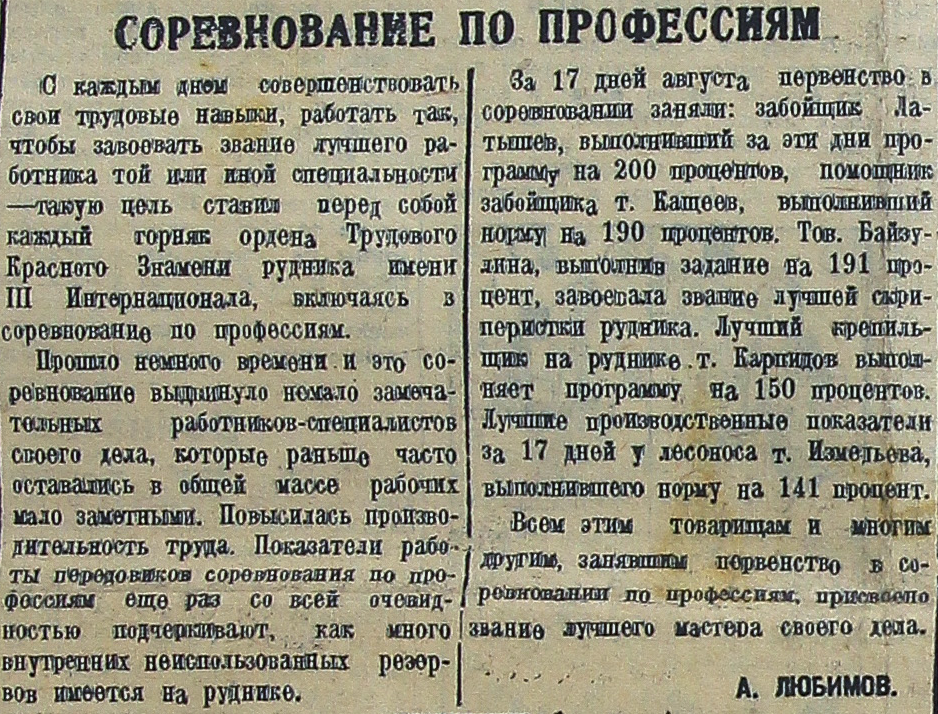 За 17 дней августа первенство в соревновании заняли: забойщик Латышев, выполнивший за эти дни программу на 200 процентов, помощник забойщика т. Кащеев, выполнивший норму на 190 процентов. Тов. Байзулина, выполнив задание на 191 процент, завоевала звание лучшей скриперистки рудника. Лучший крепельщик на руднике Карпидов выполняет программу на 150 процентов. Лучшие производственные показатели за 17 дней у лесоноса т. Измедьева, выполнившего норму на 141 процент.