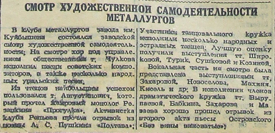 В клубе металлургов завода им. Куйбышева состоялся заводской смотр художественной самодеятельности. На смотре хор под управлением общественника т. Чулкова исполнил песни советских композиторов, а также несколько народных уральских песен.