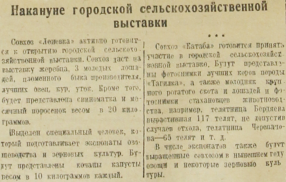Совхоз «Катаба» готовится принять участие в городской сельскохозяйственной выставке. Будут представлены фотоснимки лучших коров породы «Тагилка», а также молодняк крупного рогатого скота и лошадей и фотоснимки стахановцев животноводства, например, телятница Бердяева, вырастившая 117 телят, не допустив случаев отхода, телятница Черепанова – 65 телят и т. д.