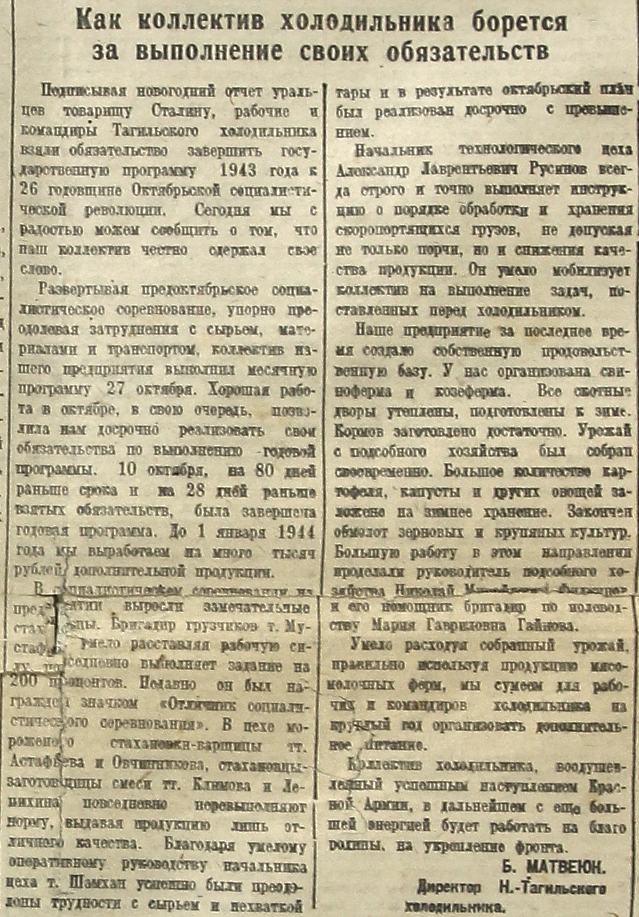 Коллектив холодильника, воодушевленный успешным наступлением Красной Армии, в дальнейшем с еще большей энергией будет работать на благо родины, на укрепление фронта.
