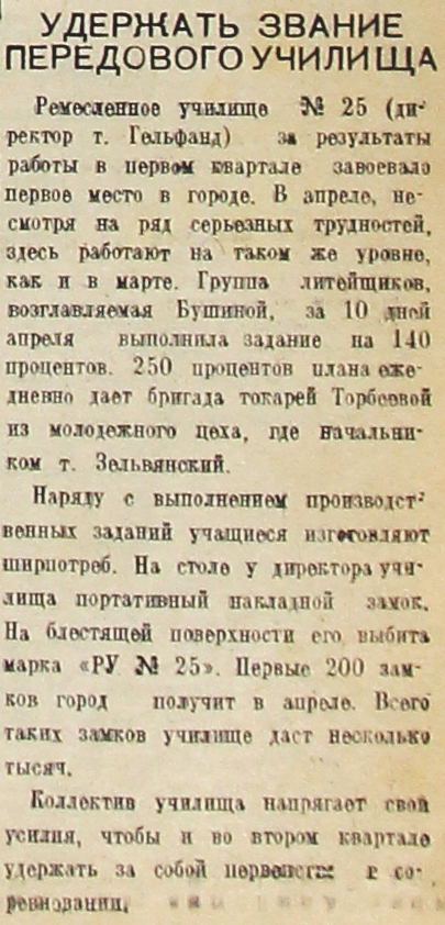 Ремесленное училище № 25 (директор т. Гельфанд) за результаты работы в первом квартале завоевало первое место в городе. В апреле, несмотря на ряд серьезных трудностей, здесь работают на таком же уровне, как и в марте. Группа литейщиков, возглавляемая Бушиной, за 10 дней апреля выполнила задание на 140 процентов. 250 процентов плана ежедневно дает бригада токарей Торбеевой из молодежного цеха, где начальником т. Зельвянский.