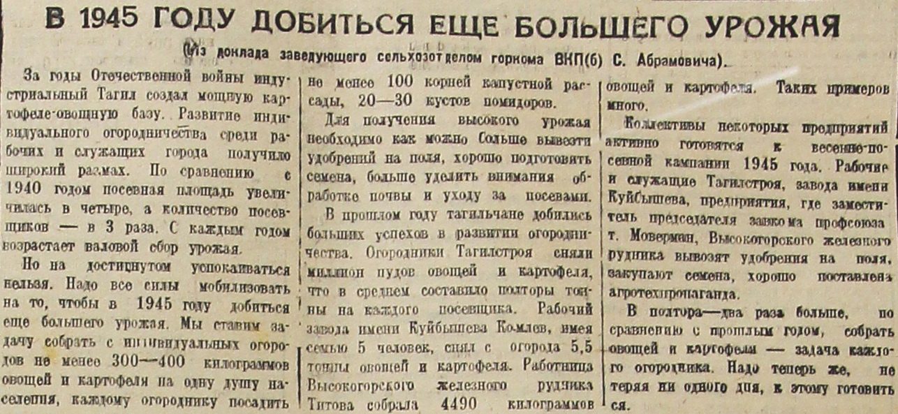 Но на достигнутом успокаиваться нельзя. Надо все силы мобилизовать на то, чтобы в 1945 году добиться еще большего урожая. Мы ставим задачу собрать с индивидуальных огородов не менее 300-400 килограммов овощей и картофеля на одну душу населения, каждому огороднику посадить не менее 100 корней капустной рассады, 20-30 кустов помидоров.