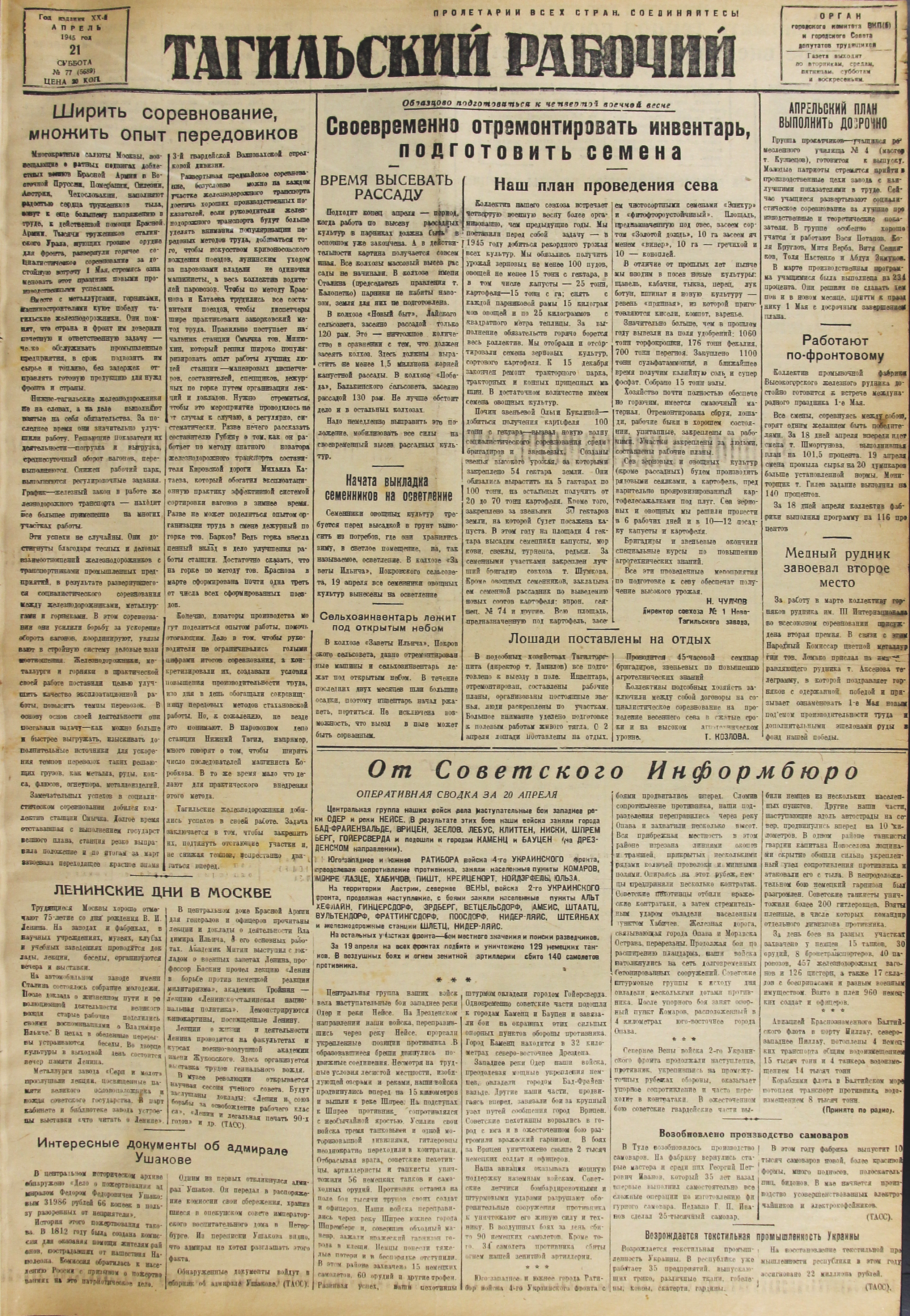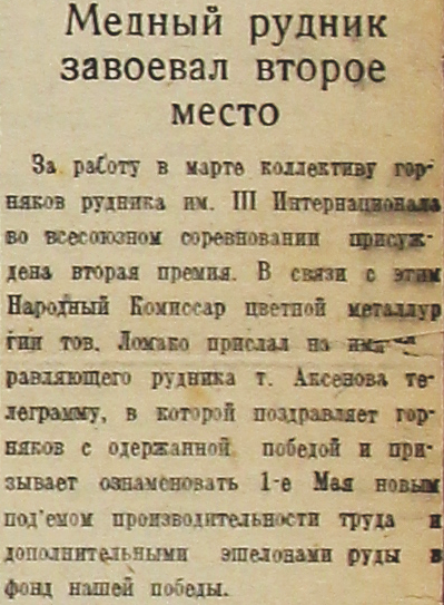 За работу в марте коллективу горняков рудника им. III Интернационала во всесоюзном соревновании присуждена вторая премия. В связи с этим Народный Комиссар цветной металлургии тов. Ломако прислал на управляющего рудника т. Аксенова телеграмму, в которой поздравляет горняков с одержанной победой и призывает ознаменовать 1-е Мая новым подъемом производительности труда и дополнительными эшелонами руды в фонд нашей победы.
