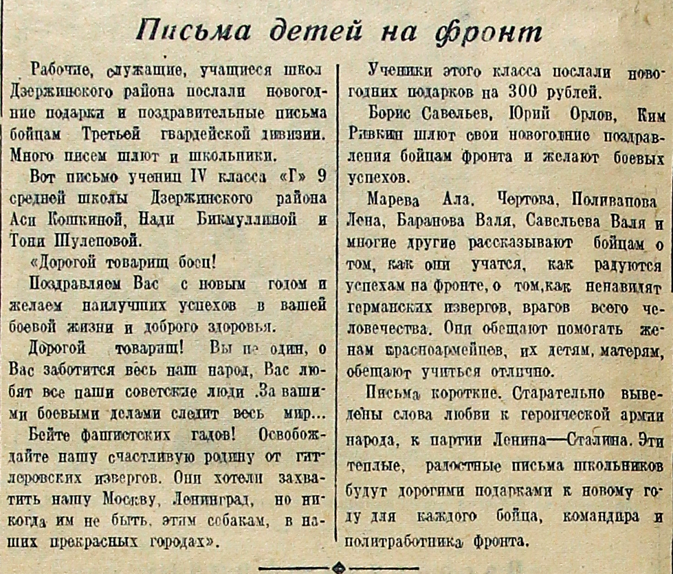 Рабочие, служащие, учащиеся школ Дзержинского района послали новогодние подарки и поздравительные письма бойцам Третьей гвардейской дивизии. Много писем шлют и школьники.