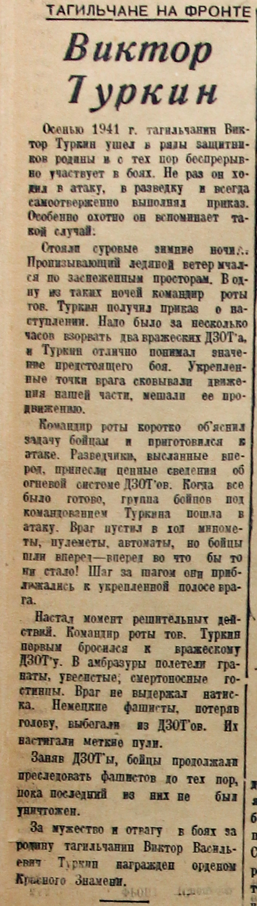 Осенью 1941 г. тагильчанин Виктор Туркин ушел в ряды защитников родины и с тех пор беспрерывно участвует в боях. Не раз он ходил в атаку, в разведку и всегда самоотверженно выполнял приказ. Особенно охотно он вспоминает такой случай.