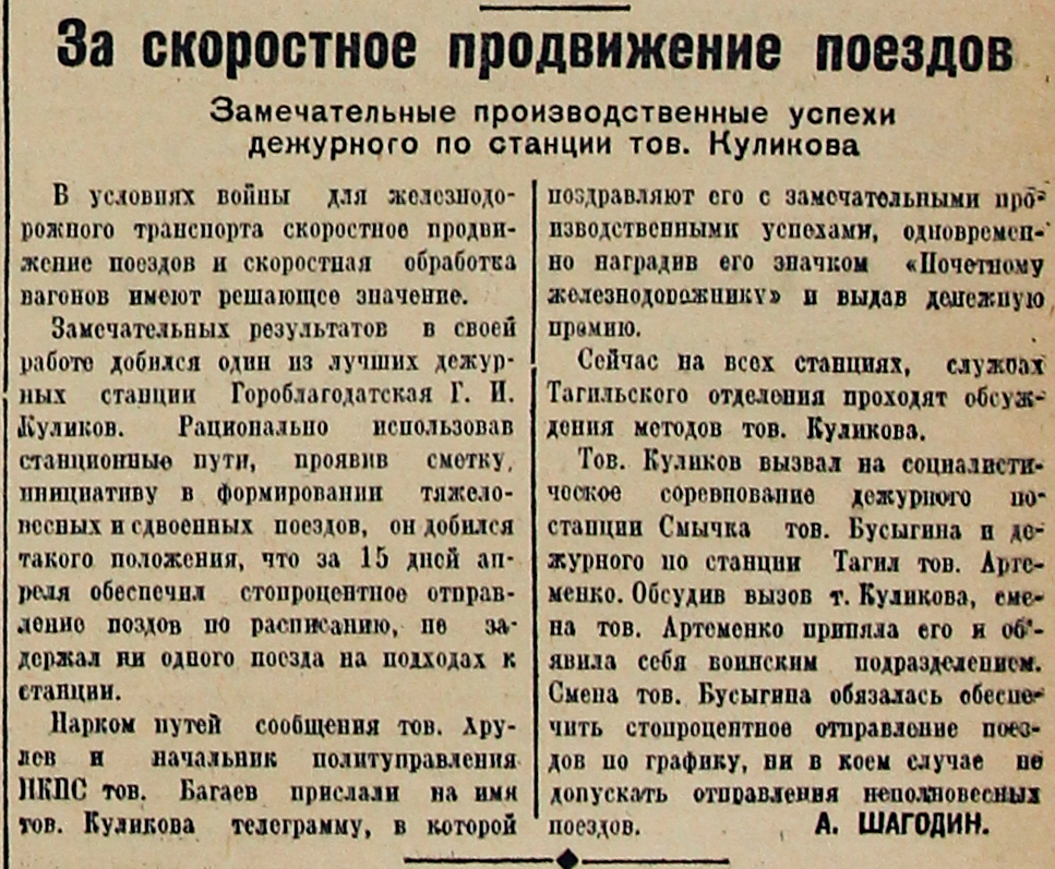 Тов. Куликов вызвал на социалистическое соревнование дежурного по станции Смычка тов. Бусыгина и дежурного по станции Тагил тов. Артеменко. Обсудив вызов т. Куликова, смена тов. Артеменко приняла его и объявила себя воинским подразделением. Смена тов. Бусыгина обязалась обеспечить стопроцентное отправление поездов по графику, ни в коем случае не допускать отправления неполновесных поездов.