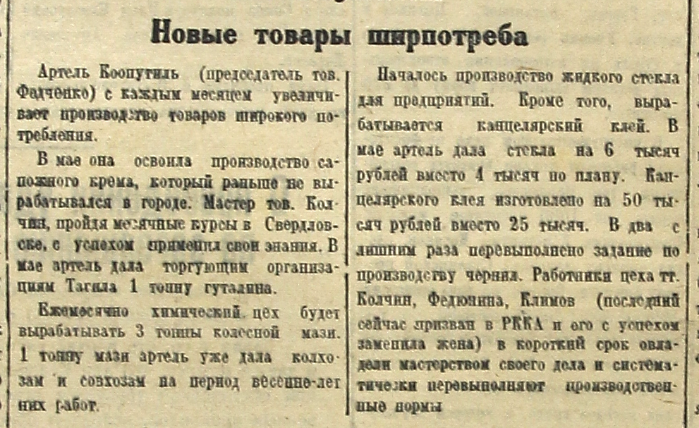 В мае она освоила производство сапожного крема, который раньше не вырабатывался в городе. Мастер тов. Колчин, пройдя месячные курсы в Свердловске, с успехом применил свои знания. В мае артель дала торгующим организациям Тагила 1 тонну гуталина.
