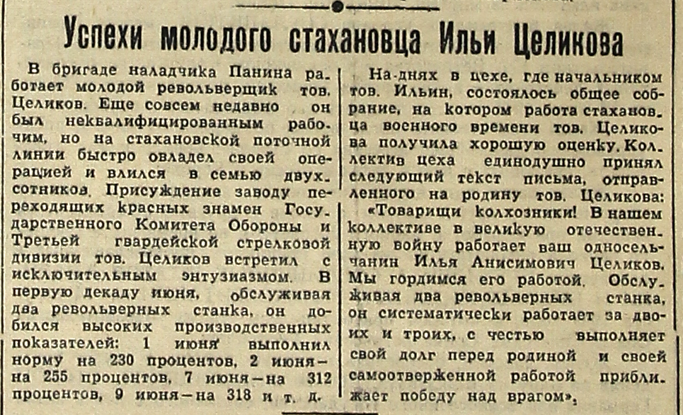На днях в цехе, где начальником тов. Ильин, состоялось общее собрание, на котором работа стахановца военного времени тов. Целикова получила хорошую оценку. Коллектив цеха единодушно принял следующий текст письма, отправленного на родину тов. Целикова: «Товарищи колхозники! В нашем коллективе в великую отечественную войну работает ваш односельчанин Илья Анисимович Целиков. Мы гордимся его работой. Обслуживая два револьверных станка, он систематически работает за двоих и троих, с честью выполняет свой долг перед родиной и своей самоотверженной работой приближает победу над врагом».