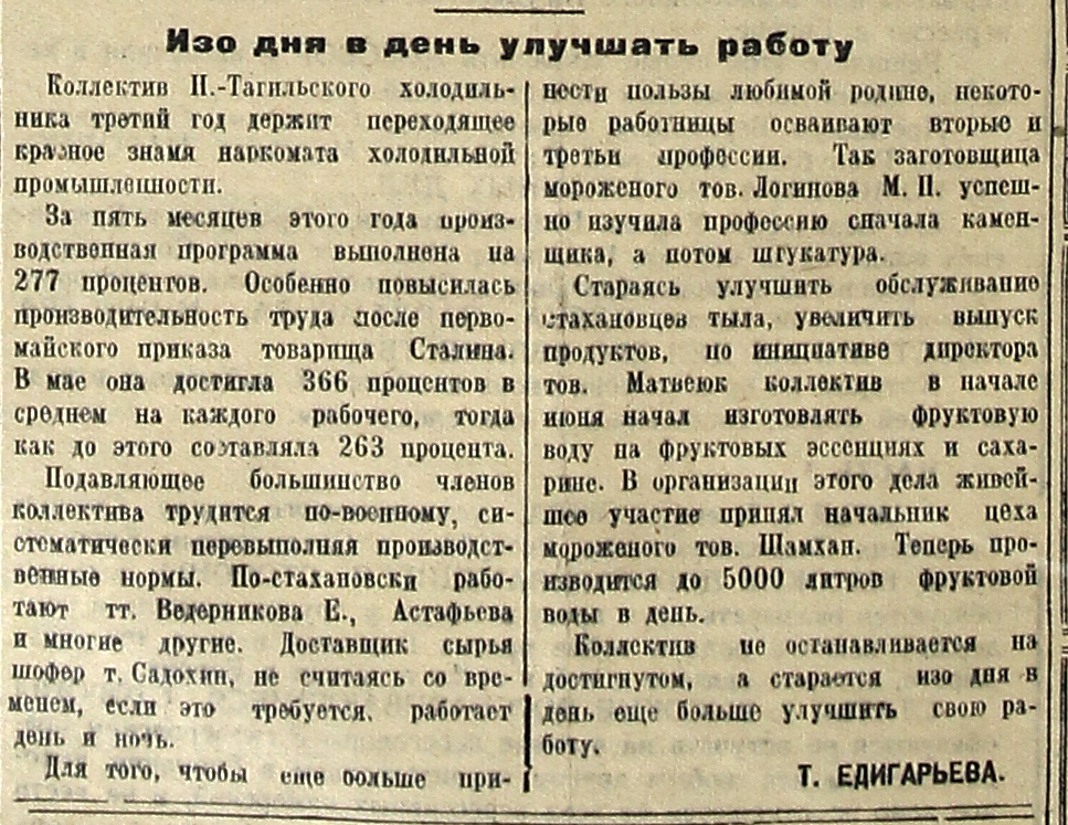 Подавляющее большинство членов коллектива трудится по-военному, систематически перевыполняя производственные нормы. По-стахановски работают тт. Ведерникова Е., Астафьева и многие другие. Доставщик сырья шофер т. Садохин, не считаясь со временем, если это требуется, работает день и ночь.