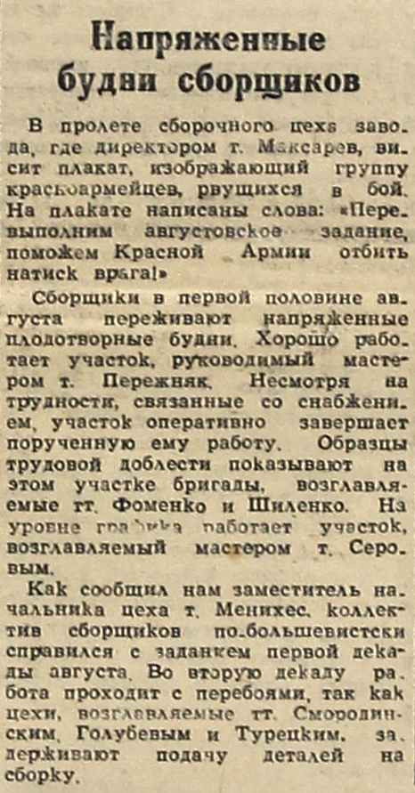 В пролете сборочного цеха завода, где директором т. Максарев, висит плакат, изображающий группу красноармейцев, рвущихся в бой. На плакате написаны слова: «Перевыполним августовское задание, поможем Красной Армии отбить натиск врага!»