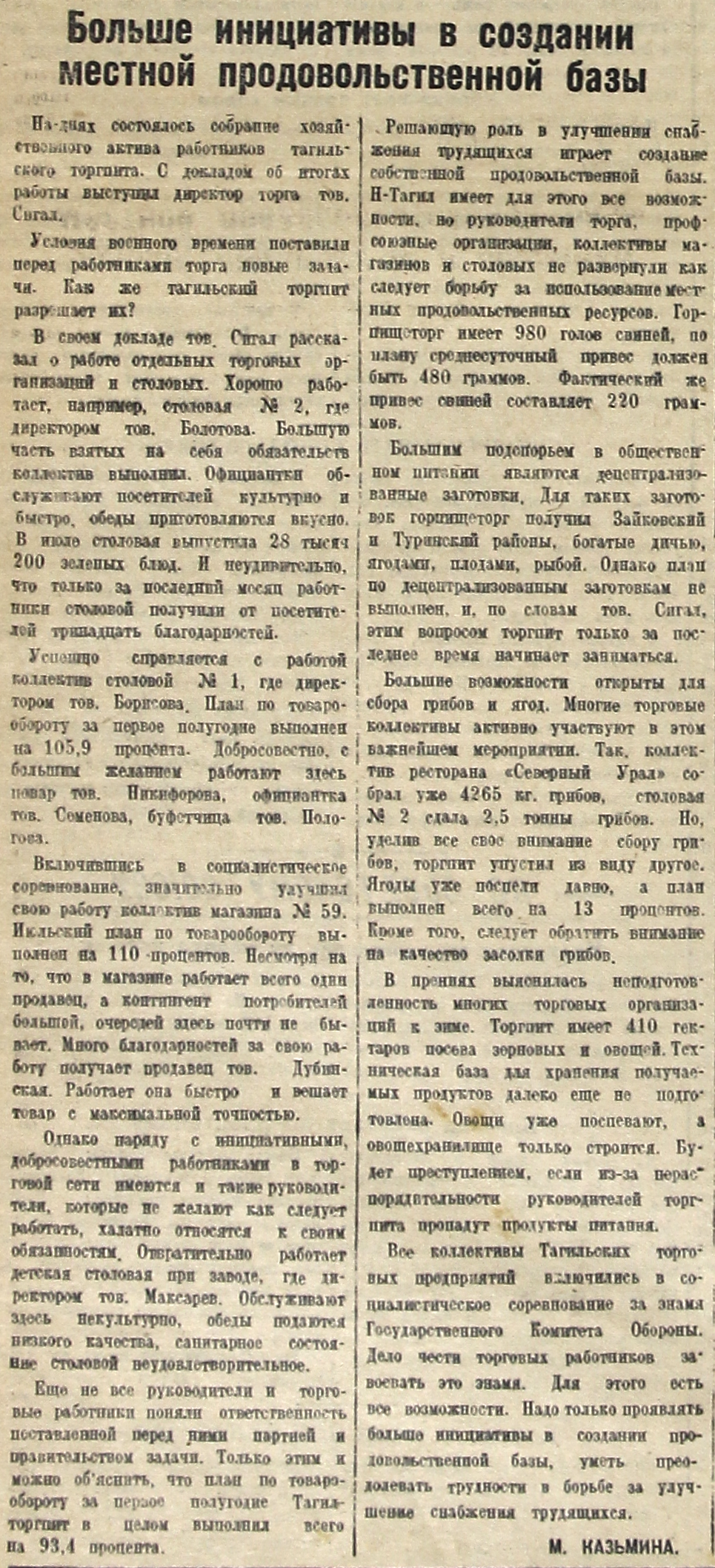 Все коллективы Тагильских торговых предприятий включились в социалистическое соревнование за знамя Государственного Комитета Обороны. Дело чести торговых работников завоевать это знамя. Для этого есть все возможности. Надо только проявлять больше инициативы в создании продовольственной базы, уметь преодолевать трудности в борьбе за улучшение снабжения трудящихся.