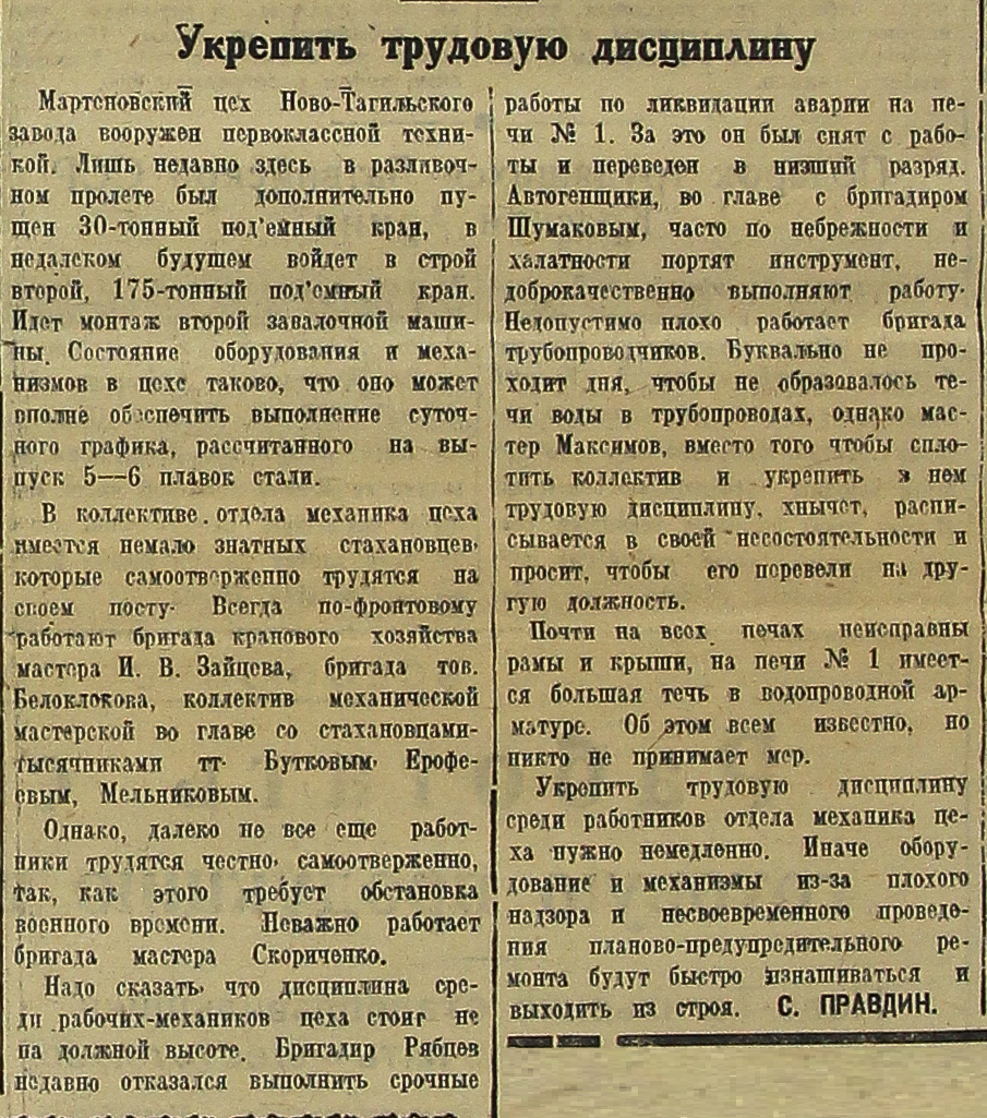 Однако, далеко но все еще работники трудятся честно, самоотверженно, так, как этого требует обстановка военного времени. Неважно работает бригада мастера Скориченко.