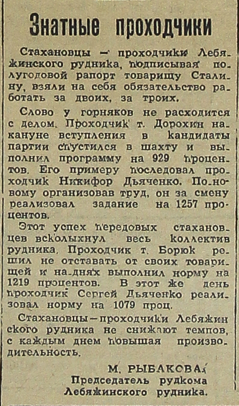 Слово у горняков не расходится с делом. Проходчик т. Дорохин накануне вступления в кандидаты партии спустился в шахту и выполнил программу на 929 процентов. Его примеру последовал проходчик Никифор Дьяченко. По-новому организовав труд, он за смену реализовал задание на 1257 процентов.