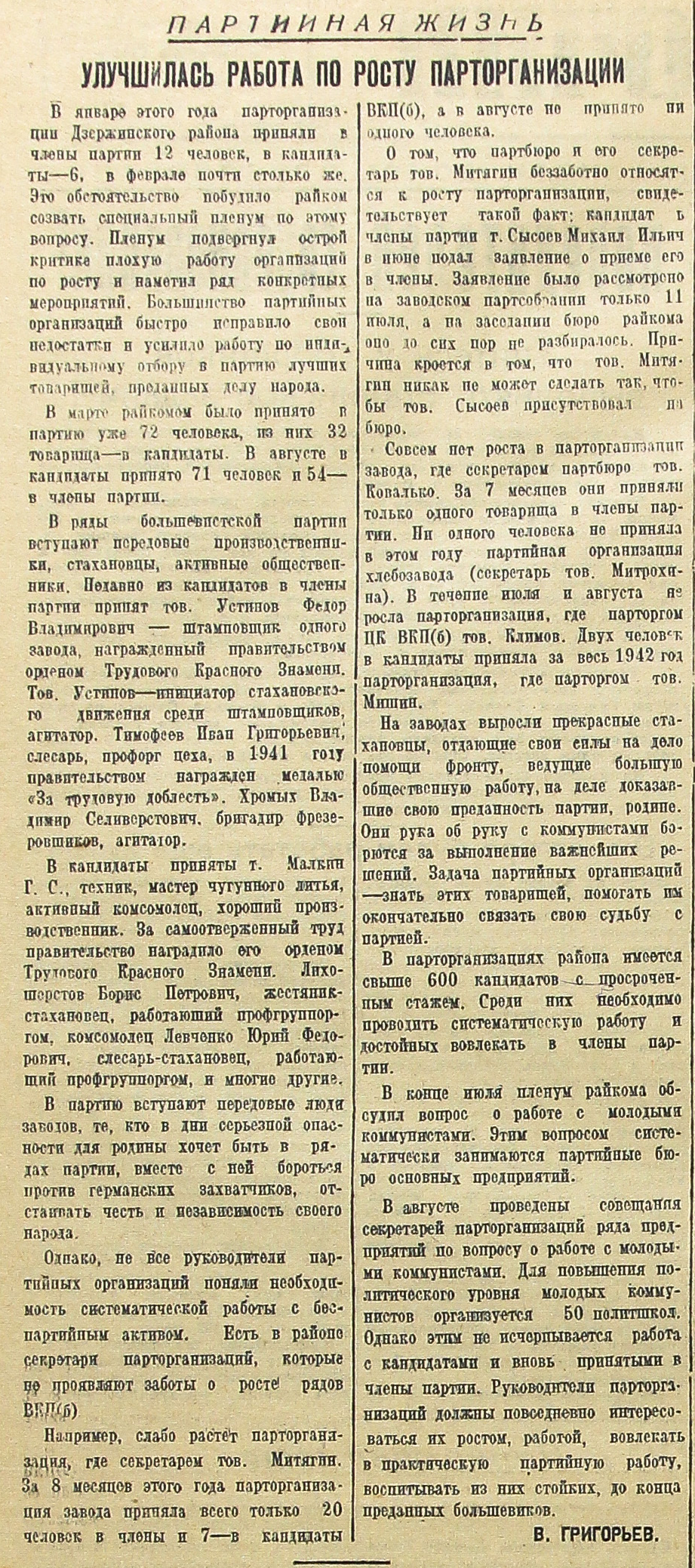 Совсем нет роста в парторганизации завода, где секретарем партбюро тов. Ковалько. За 7 месяцев они приняли только одного товарища в члены партии. Ни одного человека не приняла в этом году партийная организация хлебозавода (секретарь тов. Митрохина). В течение июля и августа не росла парторганизация, где парторгом ЦК ВКП(б) тов. Климов. Двух человек в кандидаты приняла за весь 1942 год парторганизация, где парторгом тов. Мишин.