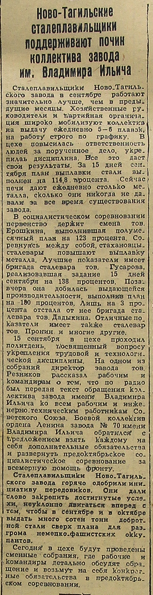 Сталеплавильщики Ново-Тагильского завода горячо одобрили инициативу передовиков. Они дали слово закрепить достигнутые успехи, неуклонно двигаться вперед с тем, чтобы в сентябре и в октябре выдать много сотен тонн добротной стали сверх плана для разгрома немецко-фашистских оккупантов.