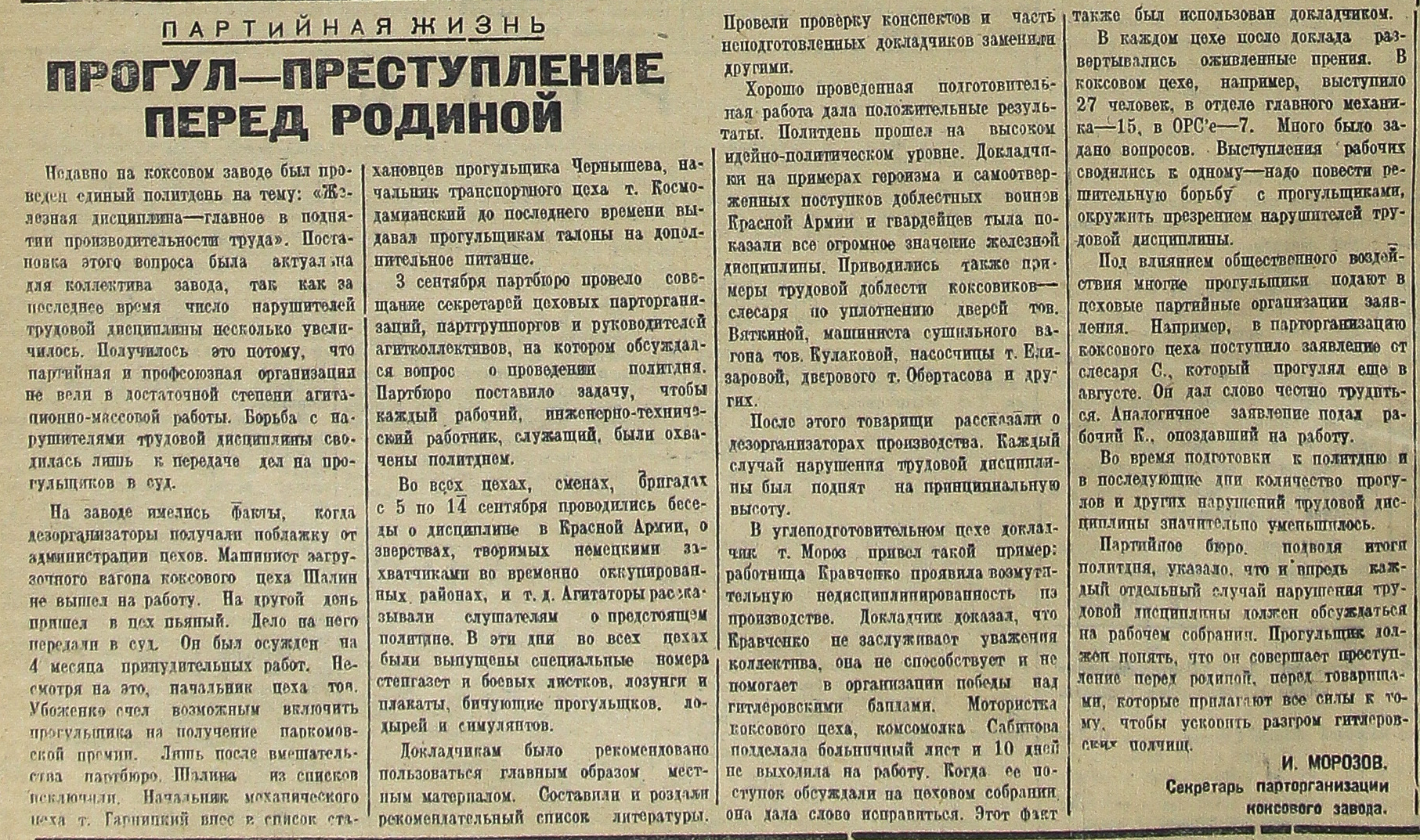 В углеподготовительном цехе докладчик т. Мороз привел такой пример: работница Кравченко проявила возмутительную недисциплинированность на производстве. Докладчик доказал, что Кравченко не заслуживает уважения коллектива, она не способствует и не помогает в организации победы над гитлеровскими бандами. Мотористка коксового цеха, комсомолка Сабинова подделала больничный лист и 10 дней не выходила на работу. Когда ее поступок обсуждали на цеховом собрании она дала слово исправиться. Этот факт также был использован докладчиком.