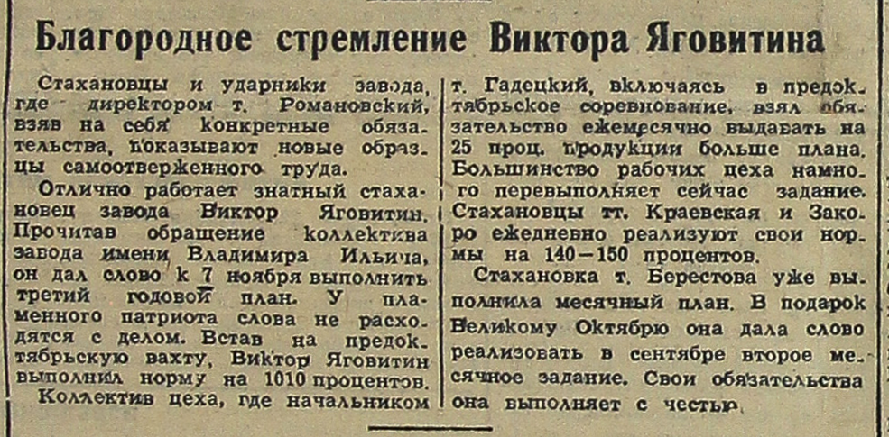 Отлично работает знатный стахановец завода Виктор Яговитин. Прочитав обращение коллектива завода имени Владимира Ильича, он дал слово к 7 ноября выполнить третий годовой план. У пламенного патриота слова не расходятся с делом. Встав на предоктябрьскую вахту, Виктор Яговитин выполнил норму на 1010 процентов.