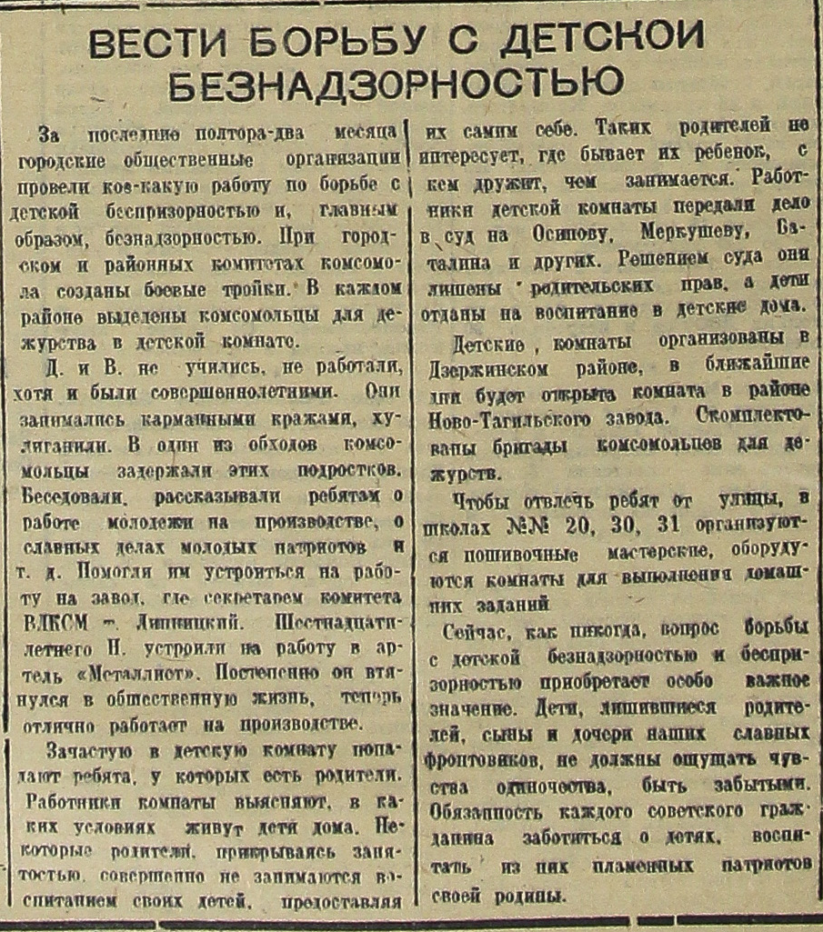 Детские комнаты организованы в Дзержинском районе, в ближайшие дни будет открыта комната в районе Ново-Тагильского завода. Скомплектованы бригады комсомольцев для дежурств.