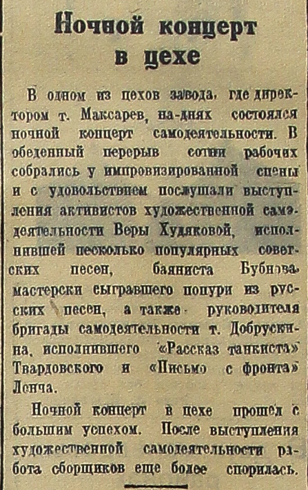 В одном из цехов завода, где директором т. Максарев, на-днях состоялся ночной концерт самодеятельности. В обеденный перерыв сотни рабочих собрались у импровизированной сцены и с удовольствием послушали выступления активистов художественной самодеятельности Веры Худяковой, исполнявшей несколько популярных советских песен, баяниста Бубнова, мастерски сыгравшего попури из русских песен, а также руководителя бригады самодеятельности т. Добрускина, исполнившего «Рассказ танкиста» Твардовского и «Письмо с фронта» Ленча.