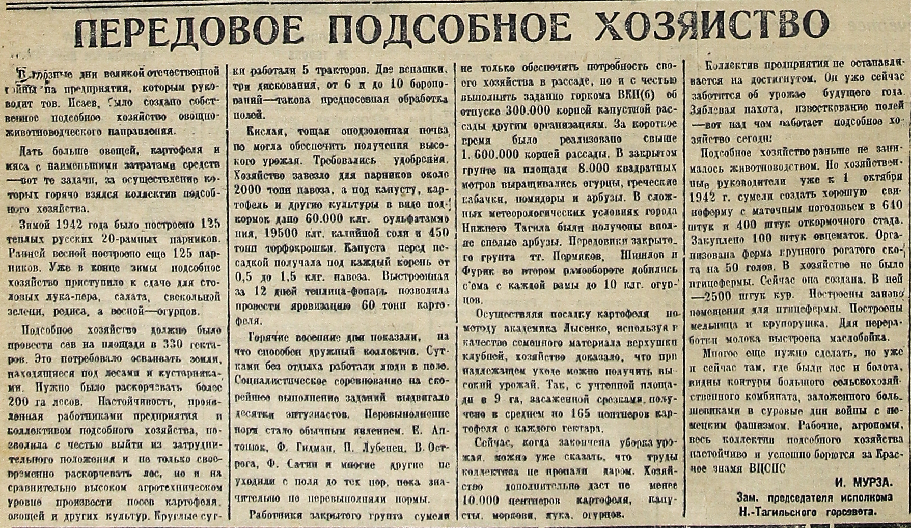 В грозные дни великой отечественной войны на предприятии, которым руководит тов. Исаев, было создано собственное подсобное хозяйство овощно-животноводческого направления.