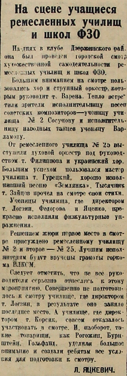 На днях в клубе Дзержинского района был проведен городской смотр художественной самодеятельности ремесленных училищ и школ ФЗО.