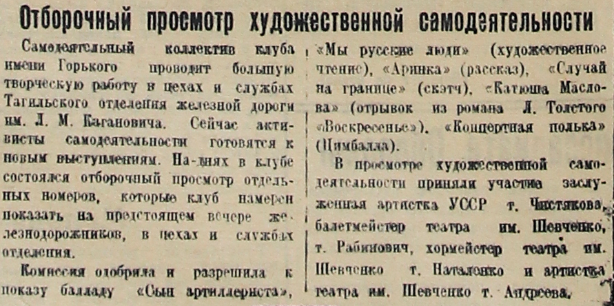 Самодеятельный коллектив клуба имени Горького проводит большую творческую работу в цехах и службах Тагильского отделения железной дороги им. Л. М. Кагановича. Сейчас активисты самодеятельности готовятся к новым выступлениям. На днях в клубе состоялся отборочный просмотр отдельных номеров, которые клуб намерен показать на предстоящем вечере железнодорожников, в цехах и службах отделения.