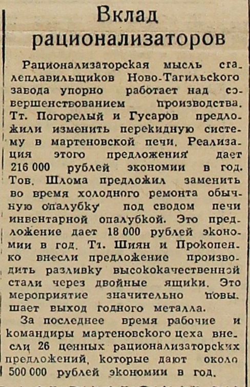 Рационализаторская мысль сталеплавильщиков Ново-Тагильского завода упорно работает над совершенствованием производства. Тт. Погорелый и Гусаров предложили изменить перекидную систему в мартеновской печи. Реализация этого предложения дает 216 000 рублей экономии в год. Тов. Шлома предложил заменить во время холодного ремонта обычную опалубку под сводом печи инвентарной опалубкой. Это предложение дает 18 000 рублей экономии в год. Тт. Шиян и Прокопенко внесли предложение производить разливку высококачественной стали через двойные ящики. Это мероприятие значительно повышает выход годного металла.
