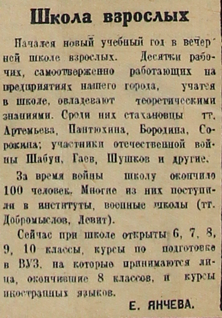 Начался новый учебный год в вечерней школе взрослых. Десятки рабочих, самоотверженно работающих на предприятиях нашего города, учатся в школе, овладевают теоретическими знаниями. Среди них стахановцы тт. Артемьева, Пантюхина, Бородина, Сорокина; участники отечественной войны Шабун, Гаев, Шушков и другие.