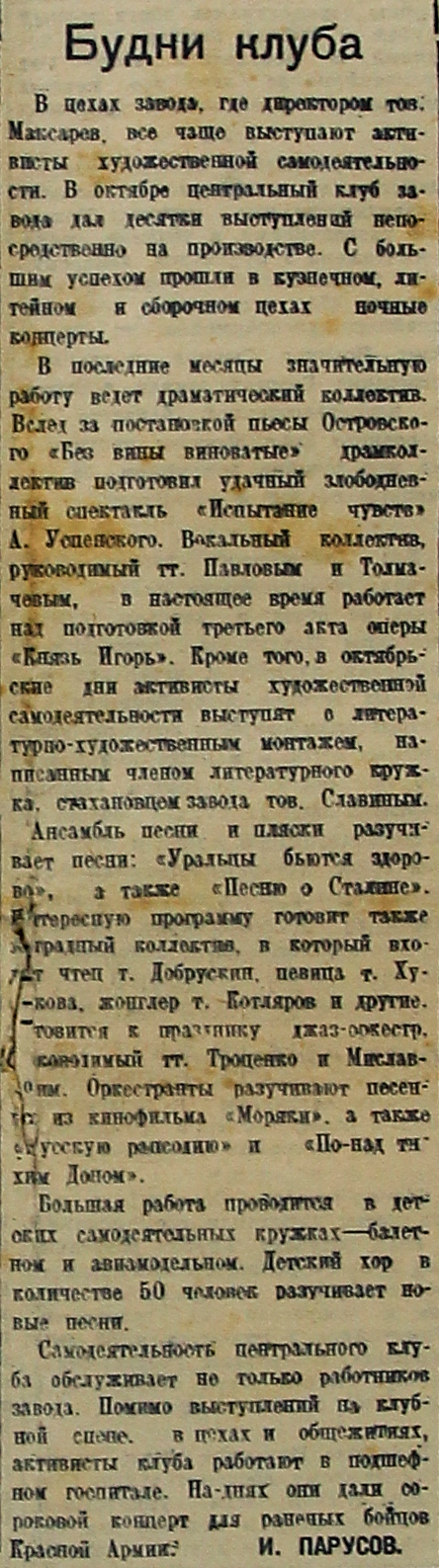 В последние месяцы значительную работу ведет драматический коллектив. Вслед за постановкой пьесы Островского «Без вины виноватые» драмколлектив подготовил удачный злободневный спектакль «Испытание чувств» А. Успенского. Вокальный коллектив, руководимый тт. Павловым и Толмачевым, в настоящее время работает над подготовкой третьего акта оперы «Князь Игорь». Кроме того, в октябрьские дни активисты художественней самодеятельности выступят с литературно-художественным монтажом, написанным членом литературного кружка, стахановцем завода тов. Славиным.