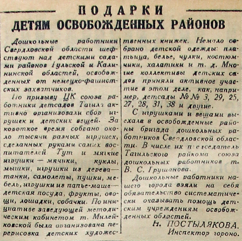По призыву ЦК союза работники детсадов Тагила активно организовали сбор игрушек и детских вещей. За короткое время собрано около тысячи разных игрушек, сделанных руками самих воспитателей. Тут и мягкие игрушки – мячики, куклы, мышки, игрушки из дерева – танки, самолеты, пушки, мебель, игрушки из папье-маше – детская посуда, фрукты, овощи, лошадки, собачки. По инициативе заведующей методическим кабинетом т. Милейковской была организована перерисовка детских художественных книжек. Немало собрано детской одежды: платьица, белье, чулки, костюмчики, халатики и т. д. Многие коллективы детских садов приняли активное участие в этом деле, как, например, детсады № № 3, 29, 25, 27, 28, 31, 38 и другие.