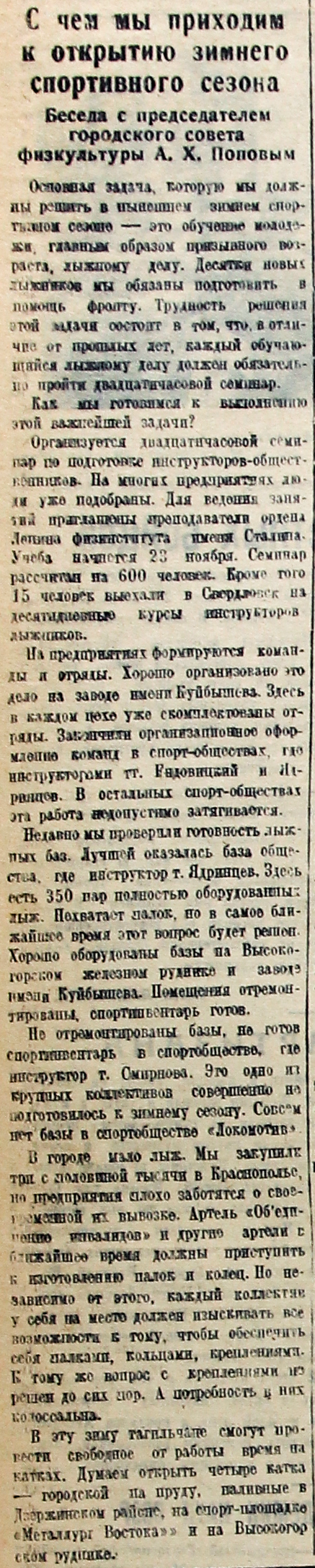 Организуется двадцатичасовой семинар по подготовке инструкторов-общественников. На многих предприятиях люди уже подобраны. Для ведения занятий приглашены преподаватели ордена Ленина физинститута имени Сталина. Учеба начнется 23 ноября. Семинар рассчитан на 600 человек. Кроме того 15 человек выехали в Свердловск на десятидневные курсы инструкторов-лыжников.