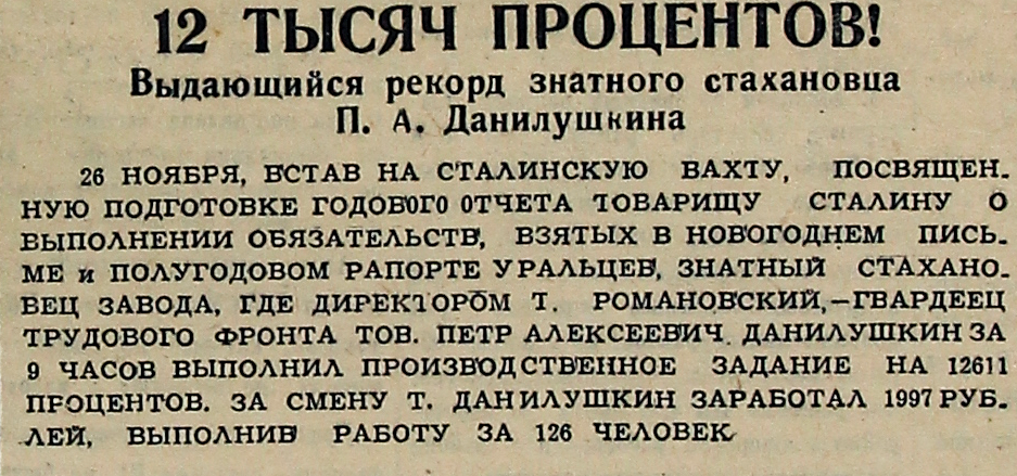 26 ноября, встав на сталинскую вахту, посвященную подготовке годового отчета товарищу Сталину о выполнении обязательств, взятых в новогоднем письме и полугодовом рапорте уральцев, знатный стахановец завода, где директором т. Романовский, – гвардеец трудового фронта тов. Петр Алексеевич Данилушкин за 9 часов выполнил производственное задание на 12600 процентов. За смену т. Данилушкин заработал 1997 рублей, выполнив работу за 126 человек.