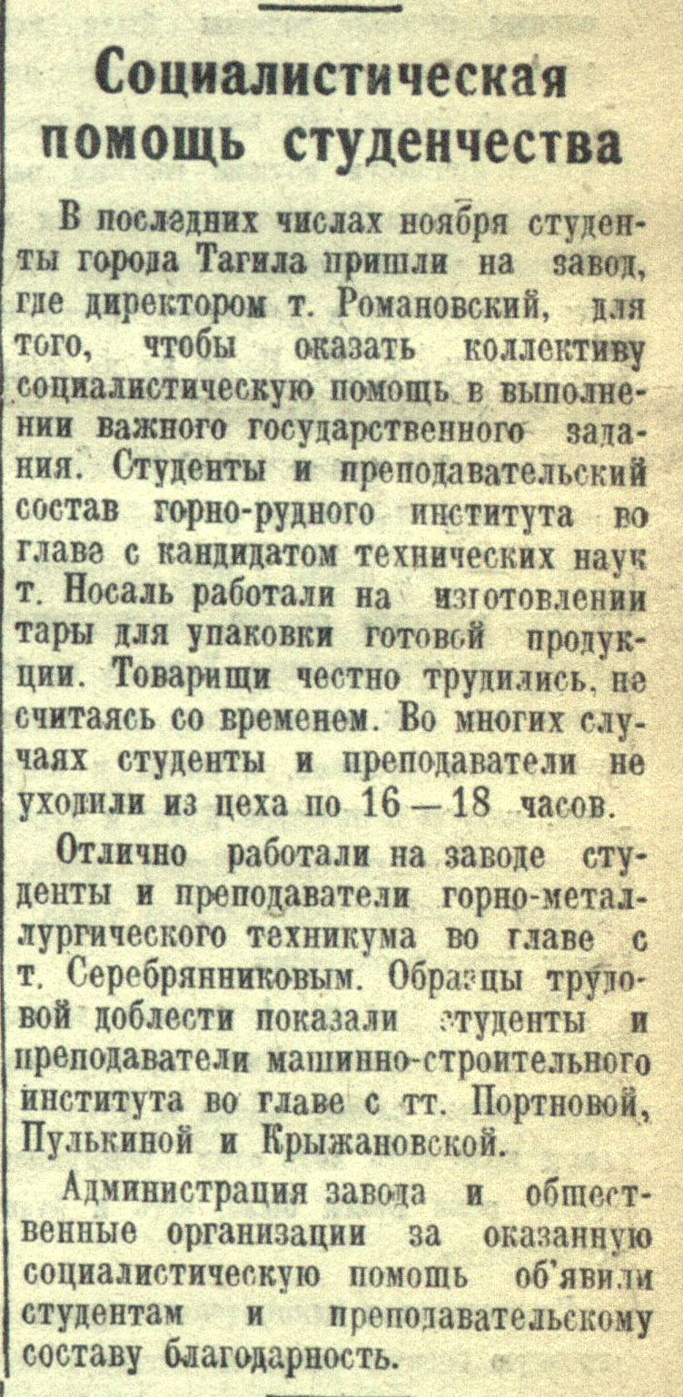 В последних числах ноября студенты города Тагила пришли на завод, где директором т. Романовский, для того, чтобы оказать коллективу социалистическую помощь в выполнении важного государственного задания. Студенты и преподавательский состав горно-рудного института во главе с кандидатом технических наук т. Носаль работали на изготовлении тары для упаковки готовой продукции. Товарищи честно трудились, не считаясь со временем. Во многих случаях студенты и преподаватели не уходили из цеха по 16-18 часов.