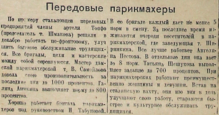 В ее бригаде каждый дает не менее 5 норм в смену. За последнее время изживаются очереди посетителей в парикмахерской, где заведующая т. Ширинкина. Все лучше работает Ангелина Пестова. В отдельные дни она дает до 8 норм. Татьяна Шешукова выполняет задание до 700 процентов. При парикмахерских работают преимущественно женщины и девушки. Встав на сталинскую вахту, они изо дня в день улучшают свою работу, стараются быстрее и культурнее обслуживать трудящихся.