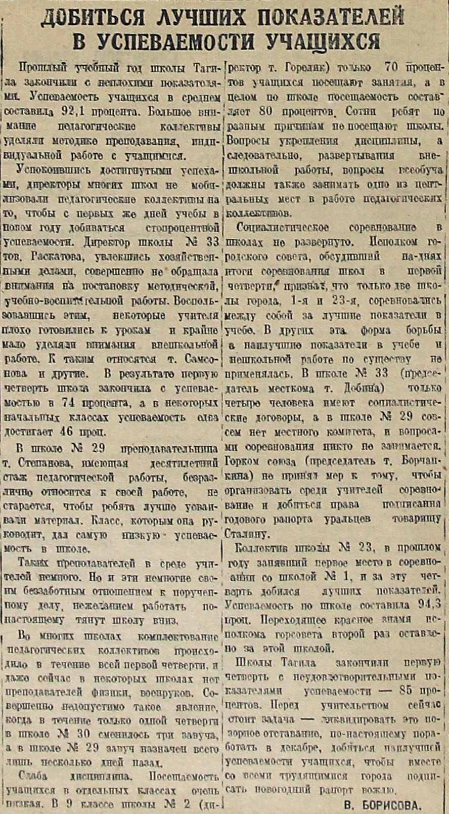 Школы Тагила закончили первую четверть с неудовлетворительными показателями успеваемости – 85 процентов. Перед учительством сейчас стоит задача – ликвидировать это позорное отставание, по-настоящему поработать в декабре, добиться наилучшей успеваемости учащихся, чтобы вместе со всеми трудящимися города подписать новогодний рапорт вождю.