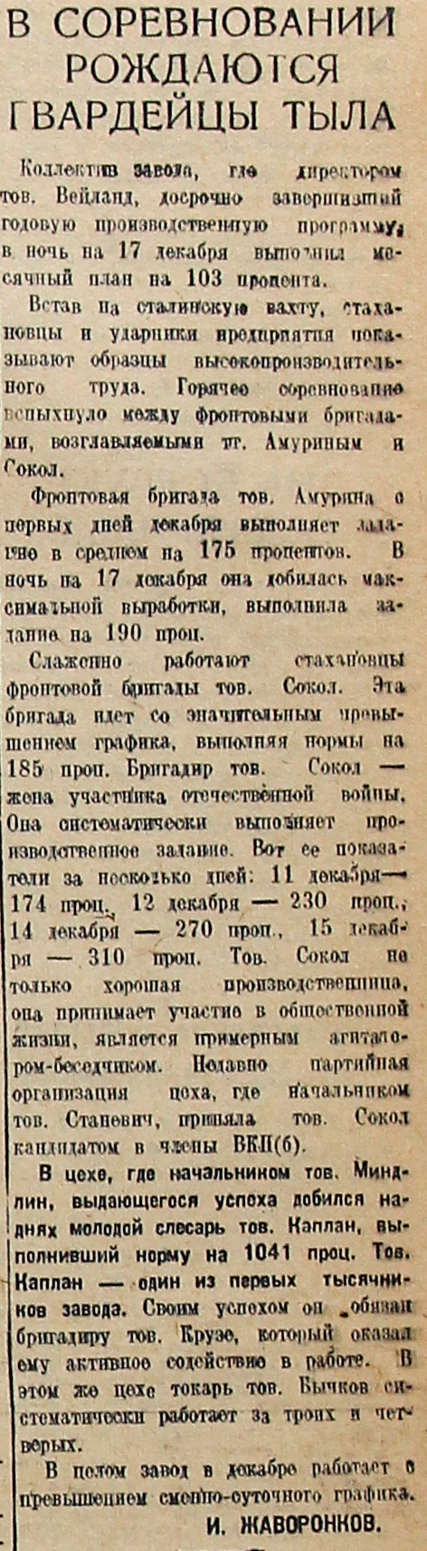 Слаженно работают стахановцы фронтовой бригады тов. Сокол. Эта бригада идет со значительным превышением графика, выполняя нормы на 185 проц. Бригадир тов. Сокол – жена участника отечественной войны. Она систематически выполняет производственное задание. Вот ее показатели за несколько дней: 11 декабря –174 проц., 12 декабря – 230 проц., 14 декабря – 270 проц., 15 декабря – 310 проц. Тов. Сокол не только хорошая производственница, она принимает участие в общественной жизни, является примерный агитатором-беседчиком. Недавно партийная организация цеха, где начальником тов. Станевич, приняла тов. Сокол кандидатом в члены ВКП(б).