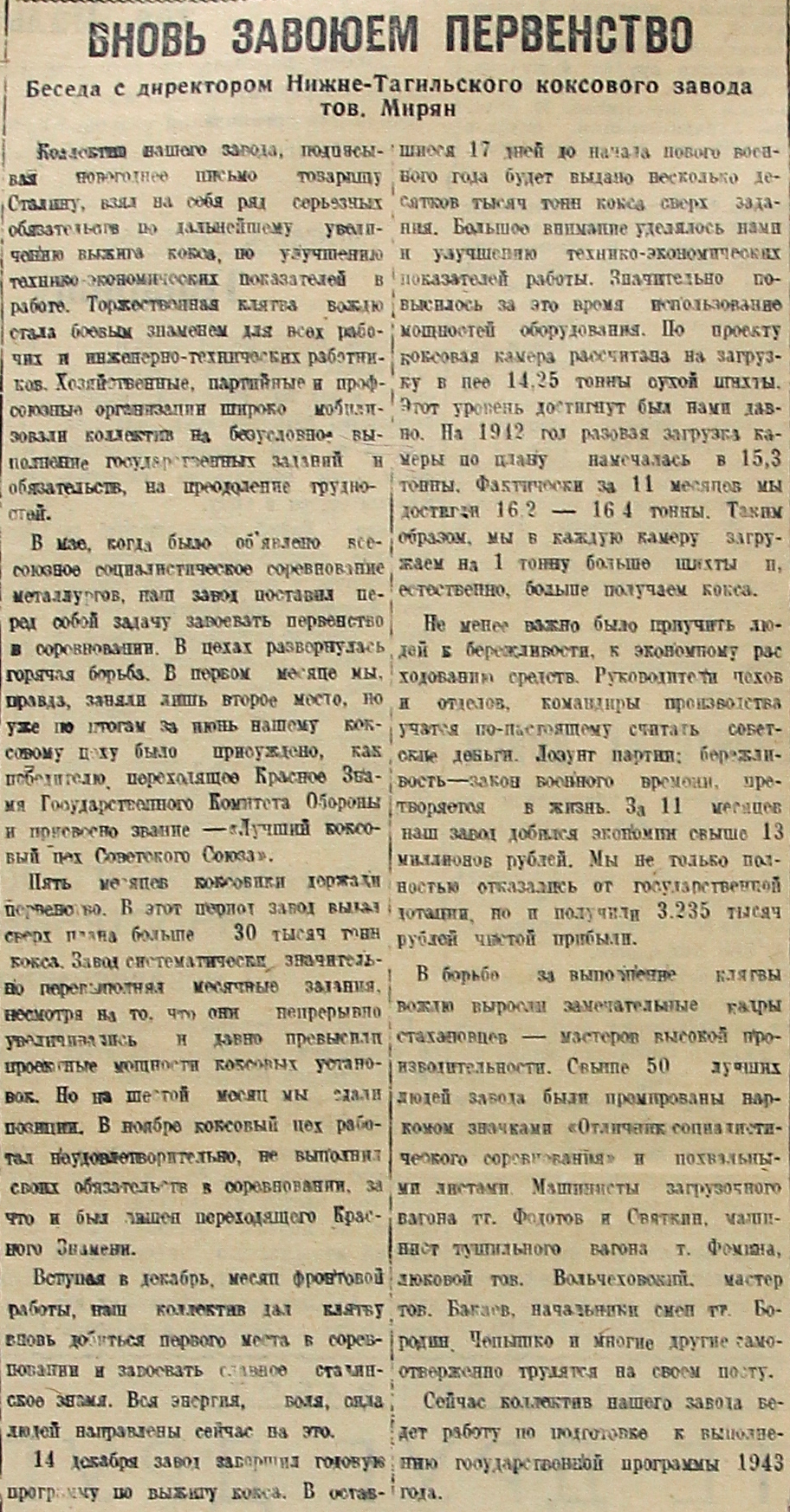 Беседа с директором Нижне-Тагильского коксового завода тов. Мирян.
