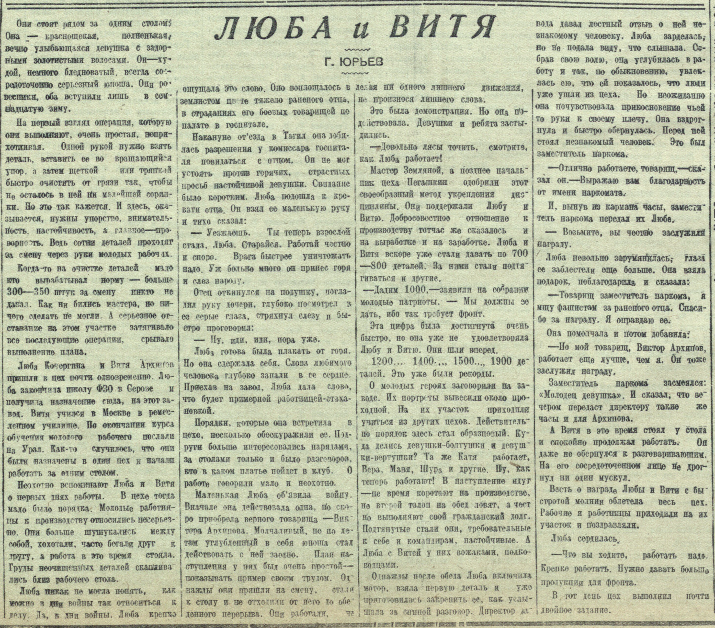 Люба Кочергина и Витя Архипов пришли в цех почти одновременно. Люба закончила школу ФЗО в Серове и получила назначение сюда, на этот завод. Витя учился в Москве в ремесленном училище. По окончании курса обучения молодого рабочего послали на Урал. Как-то случилось, что они были назначены в один цех и начали работать за одним столом.