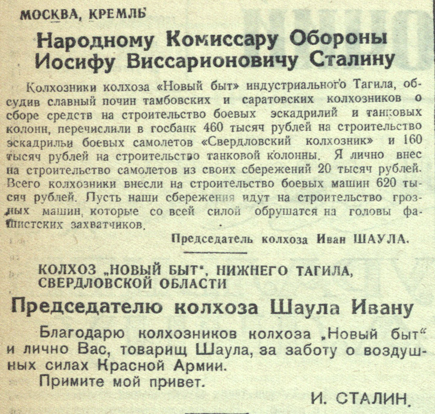 Колхозники колхоза «Новый быт» индустриального Тагила, обсудив славный почин тамбовских и саратовских колхозников о сборе средств на строительство боевых эскадрилий и танковых колонн, перечислили в госбанк 460 тысяч рублей на строительство эскадрильи боевых самолетов «Свердловский колхозник» и 160 тысяч рублей на строительство танковой колонны. Я лично внес на строительство самолетов из своих сбережений 20 тысяч рублей. Всего колхозники внесли на строительство боевых машин 620 тысяч рублей. Пусть наши сбережения идут на строительство грозных машин, которые со всей силой обрушатся на головы фашистских захватчиков.